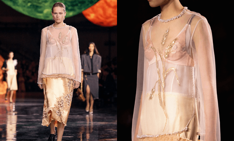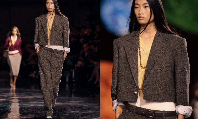 Within that stellar shell, the clothes themselves were quietly radical. The opening sequence featured androgynous suiting — a nod to Coco Chanel’s early borrowing from menswear — with dropped waists and elongated silhouettes that relaxed traditional structure. Silks, long button-up shirts, twin sets with raw edges, and airy layering offered a fluid, contemporary sensibility.